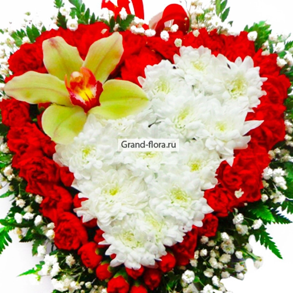 ЛЮКС гвоздика красная кустовая - 28 шт., хризантема кустовая белая  - 7 шт., орхидея (цветок) - 2 шт., гипсофила -  3 шт., папоротник - 5 шт., лента, оазис сердце.